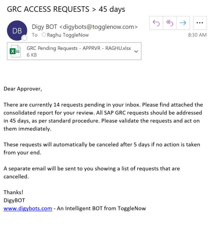 Is your SAP GRC team also compiling the list of open GRC Requests manually? It might be worth your time to review this article? In this case, we created a BOT based automation for one of our clients. We added intelligence to this robot, which identifies requests that are older than 45 days, and delivers a consolidated report (as an attachment) to all approvers, which is delivered on their email ID.