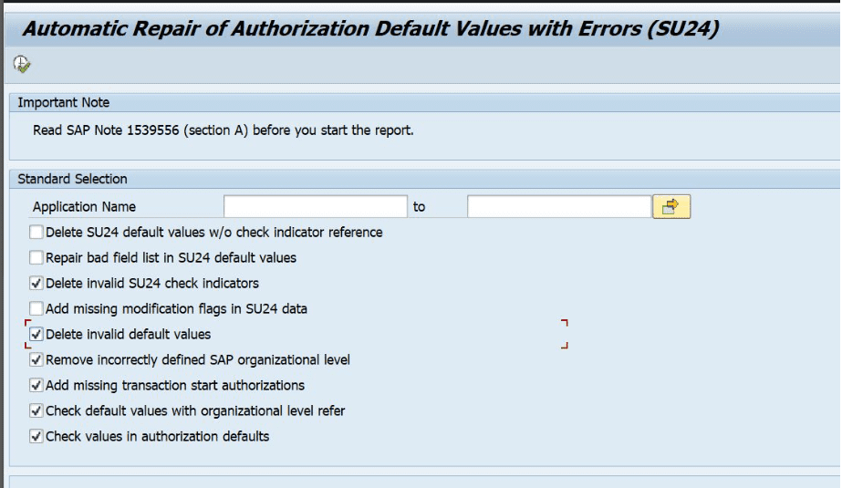 - Repair Bad Field List in SU24 Default Values: Checks and corrects default authorization objects, removing incomplete or incorrect values.